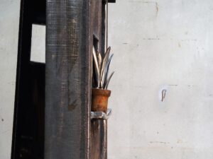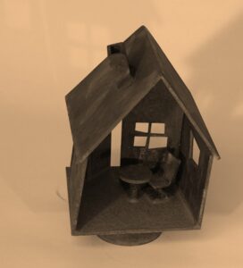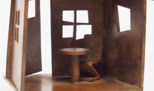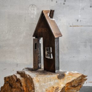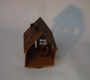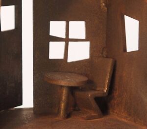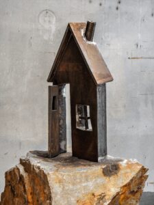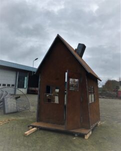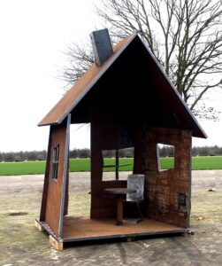 En nu is er dit huisje uit je kindertijd, 4 meter hoog. De wanden zijn van 5 cm dik staal gemaakt. Dat is echt heel dik. Binnen is het alsof je in je kindertijd onder een laken onder de tafel zit.