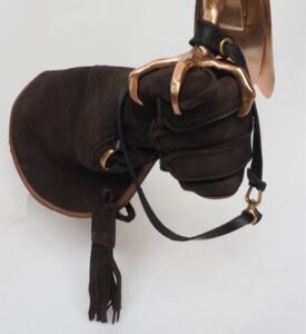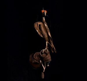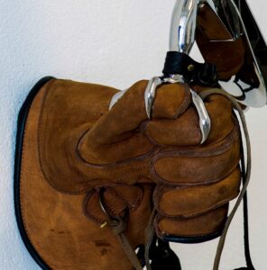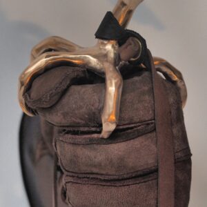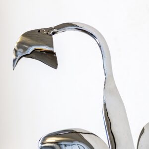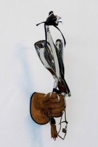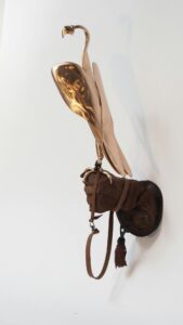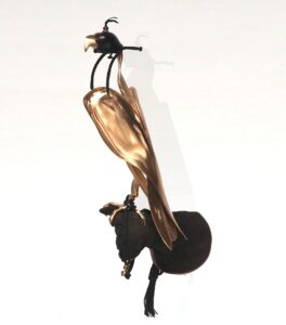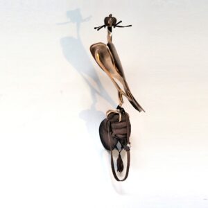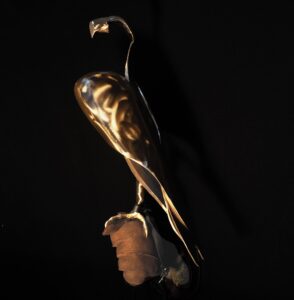 De valk “You can’t domesticate a falcon” zei een galleriehouder uit Parijs.Met minimale lijnen heb ik deze prachtige vogel vorm gegeven. Soms in brons en soms gepolijst RVS.De klauw grijpt zich vast in de handschoen van herteleer en laat meteen sporen na van de vlijmscherpe nagels.