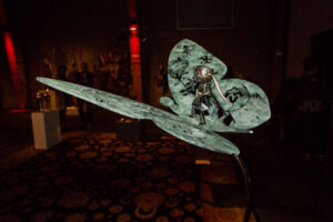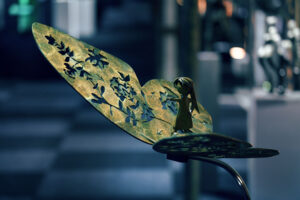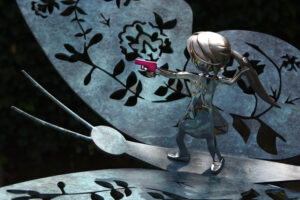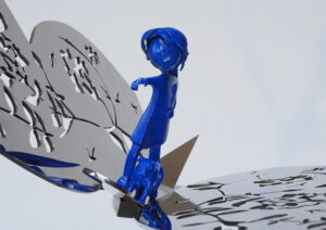 Alice in Wonderland zou ook de titel van al deze beelden kunnen zijn. Want een jong meisje vliegt haar droomwereld in. Ze staat stoer overeind op de rug van de vlinder en wijst overtuigt waar zij naar toe wil.